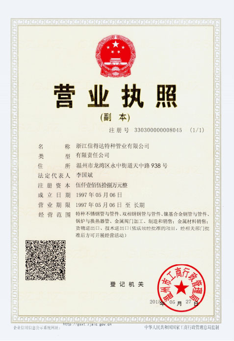 浙江信得達(dá)特種管業(yè)有限公司成立于1997年,占地面積28000平方米,注冊資金5158萬元,是國家高新技術(shù)企業(yè)、浙江省專精特新企業(yè),有4家控股公司,產(chǎn)品覆蓋了特種無縫換熱器管、高品質(zhì)不銹鋼管、鍛壓閥門制造商。